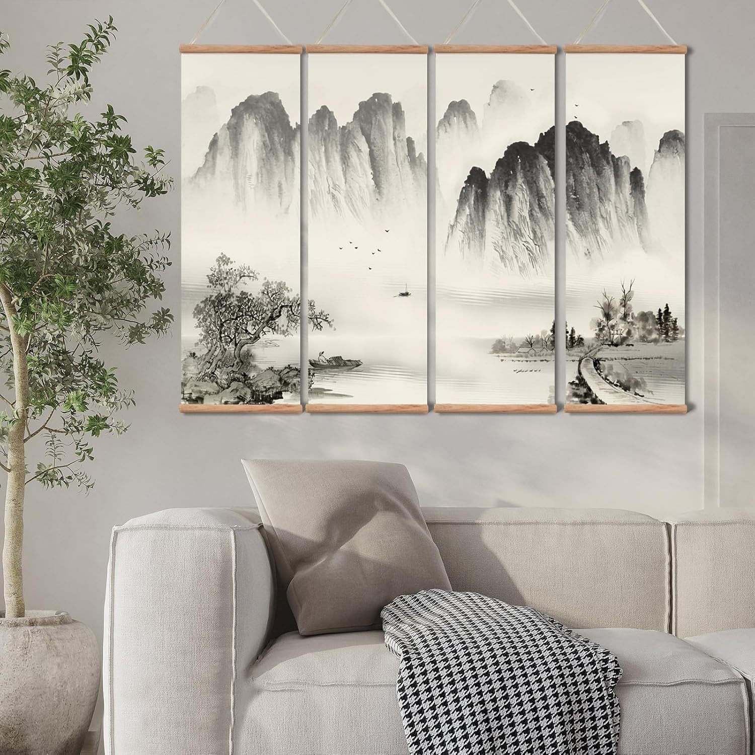 Landscape Painting,Chinese Ancient Architecture Posters and Prints,traditional Ink Decor,Wall Art Black and White for Living Room Bedroom,4 Piece Set Fixed Wooden Hanging Scroll (landscape, 12”x36”x4piece)